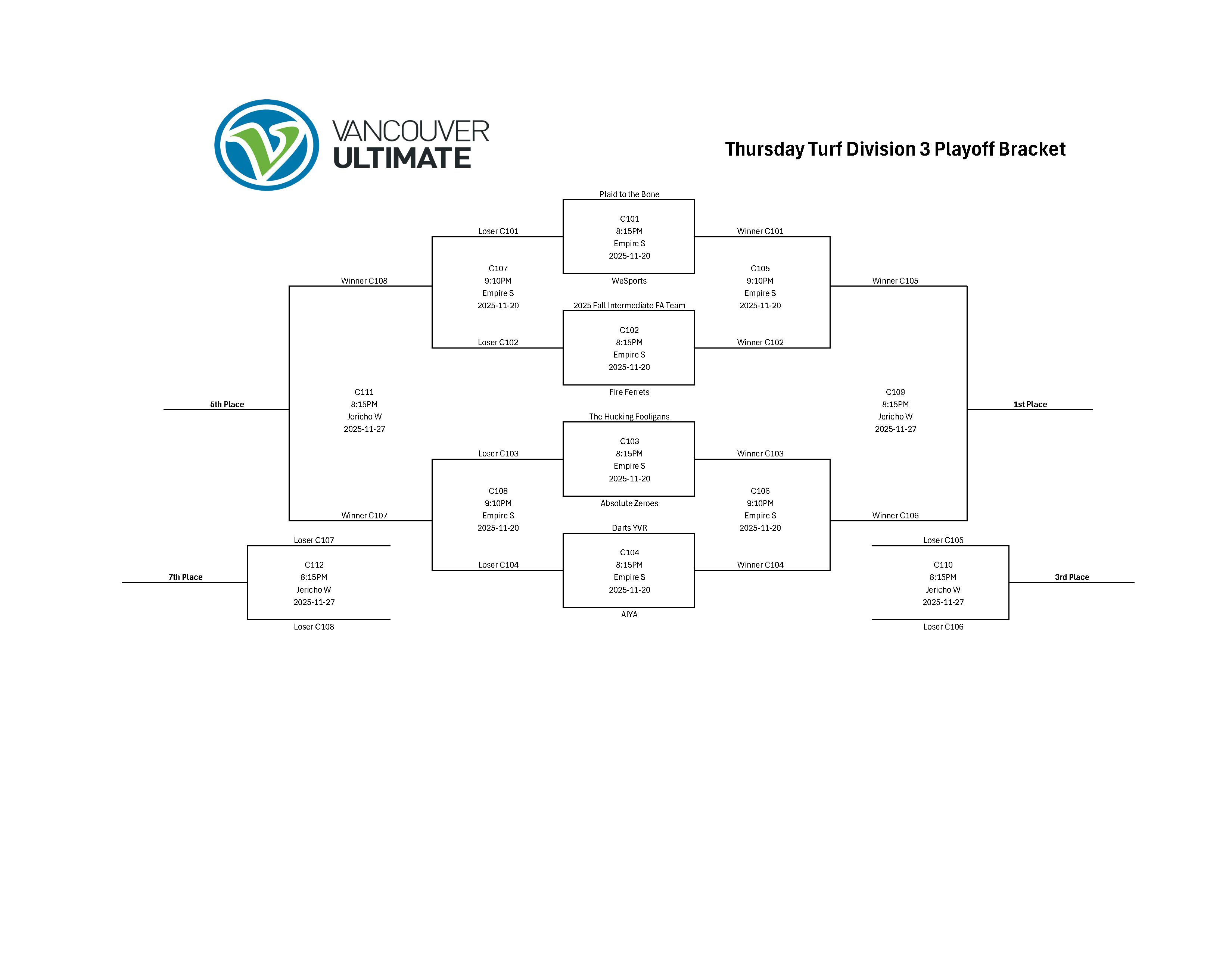 | 2025 Fall Turf Thursday Intermediate Free Agent Team | Darts YVR | 18 – 16 Unconfirmed |
