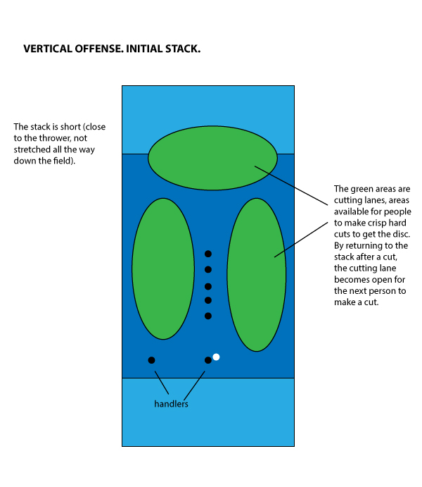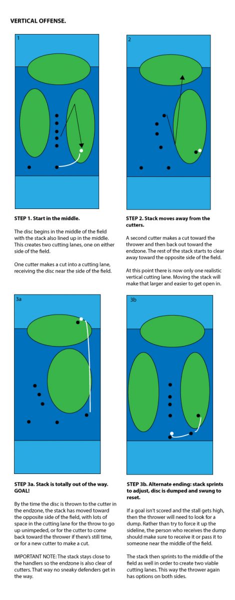 There are a lot of moving pieces and many things to remember. You should read this page over and over as you continue playing, putting the skills into practice. When everyone on your team works together to advance the disc, it looks like a well conducted orchestra. For a moving graphic of what vertical can look like, check out this video explaining how it works in basic animation.