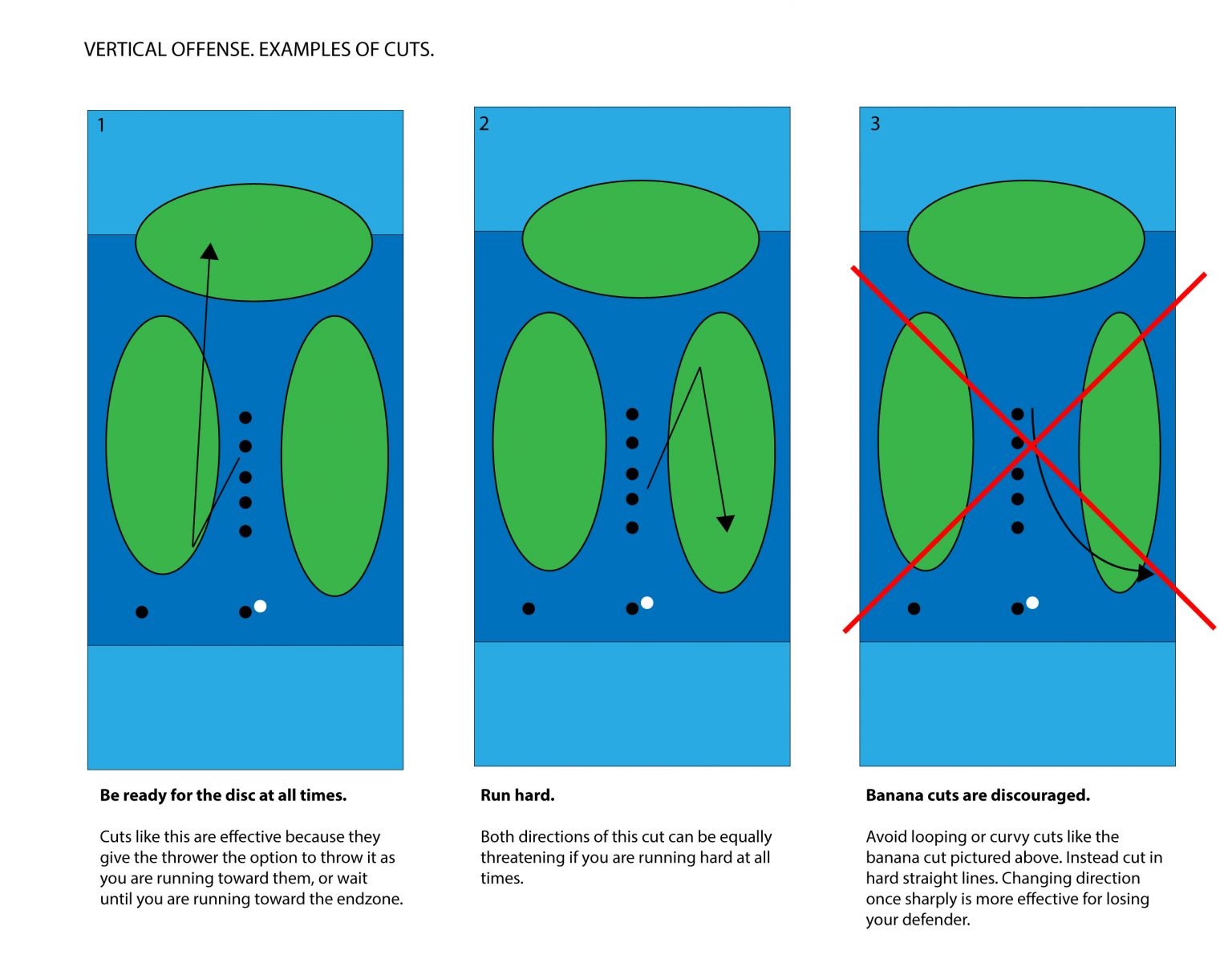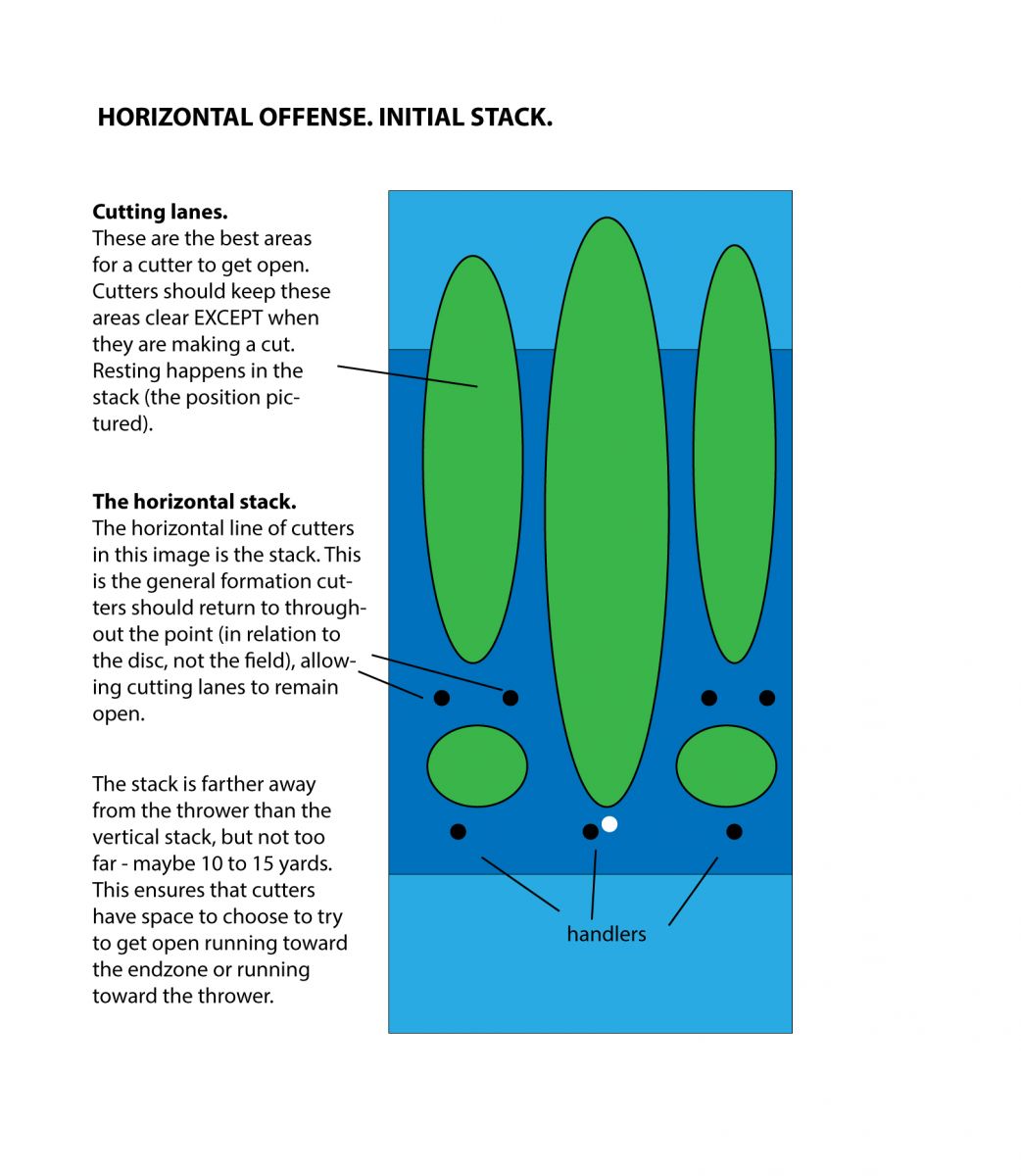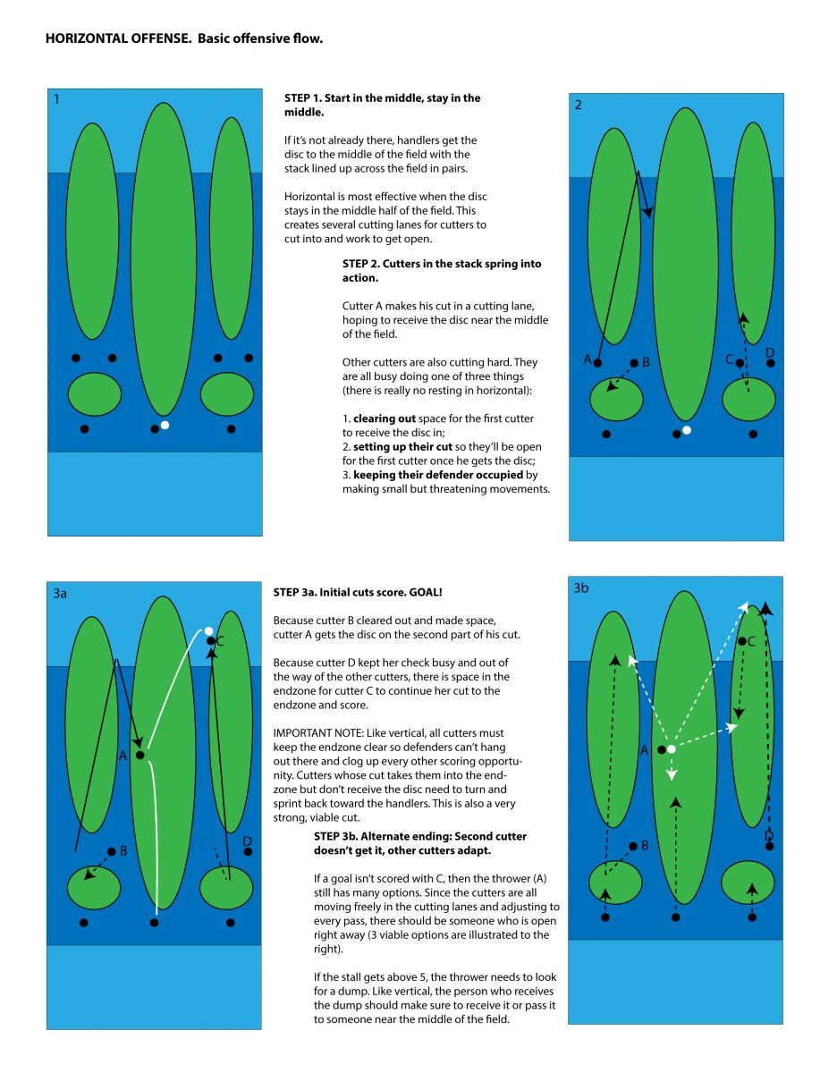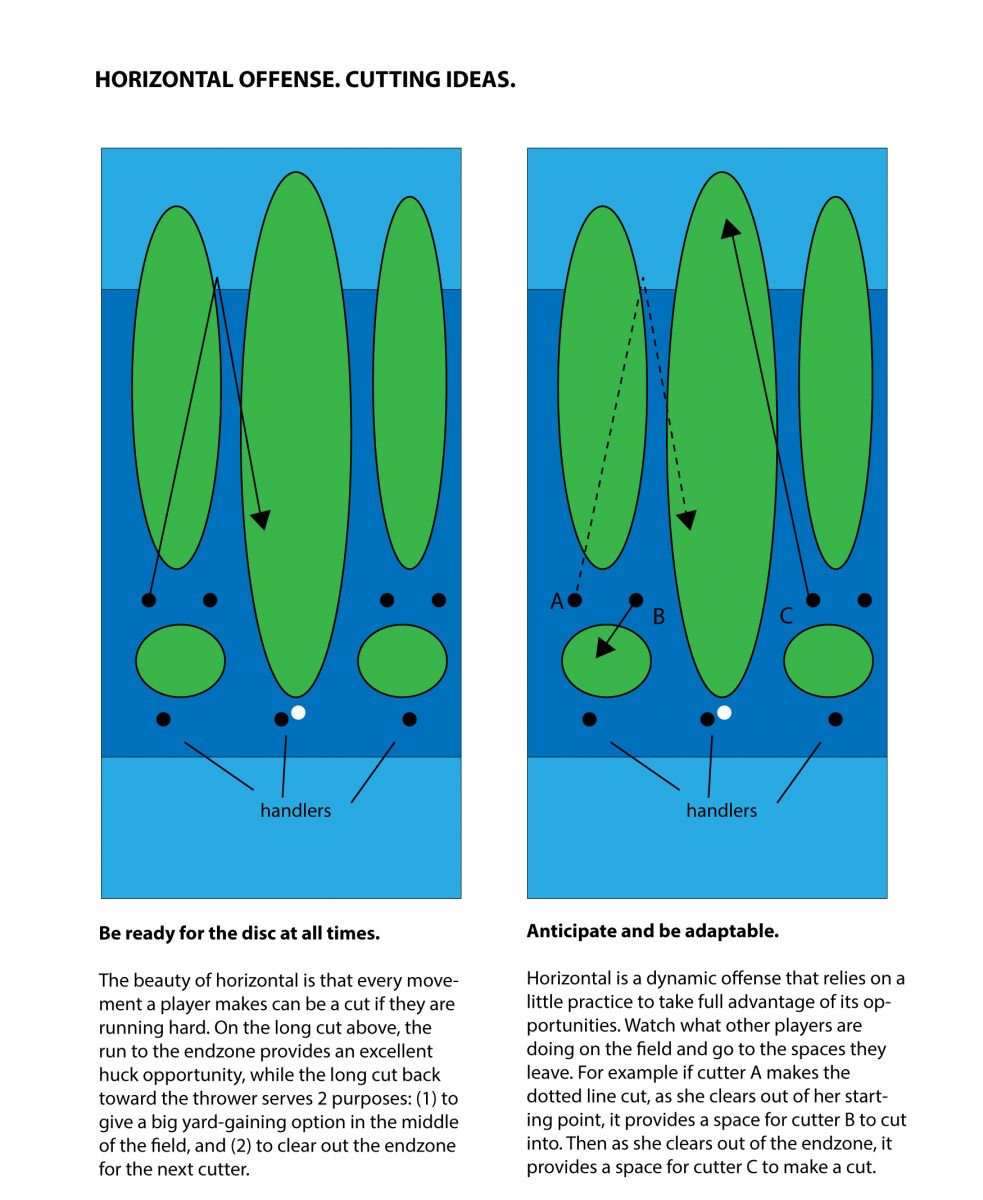 In horizontal two or more people can be making cuts at once, and if the cuts are effective this can create two or more viable options for the thrower. Assuming handlers have the ability to throw all of the throws, a team can truly take advantage of whatever the defense is not defending effectively. Remember to always make safe cuts that avoid risking injury to you or other players!